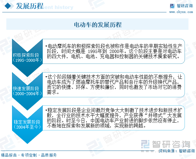 从1995年清华大学研制的第一台轻型电动车问世,到现在林林总总的电动车系列产品,过去的二十年中,中国电动摩托车事业从无到有,再发展成为目前全球最大的轻型电动车产业,短短数十载,已经成就了让全球仰慕的电动车产业。电动车摩托车行业的发展,业内普遍认为已经历了三个发展阶段:积极探索阶段、快速发展阶段、稳定发展阶段。